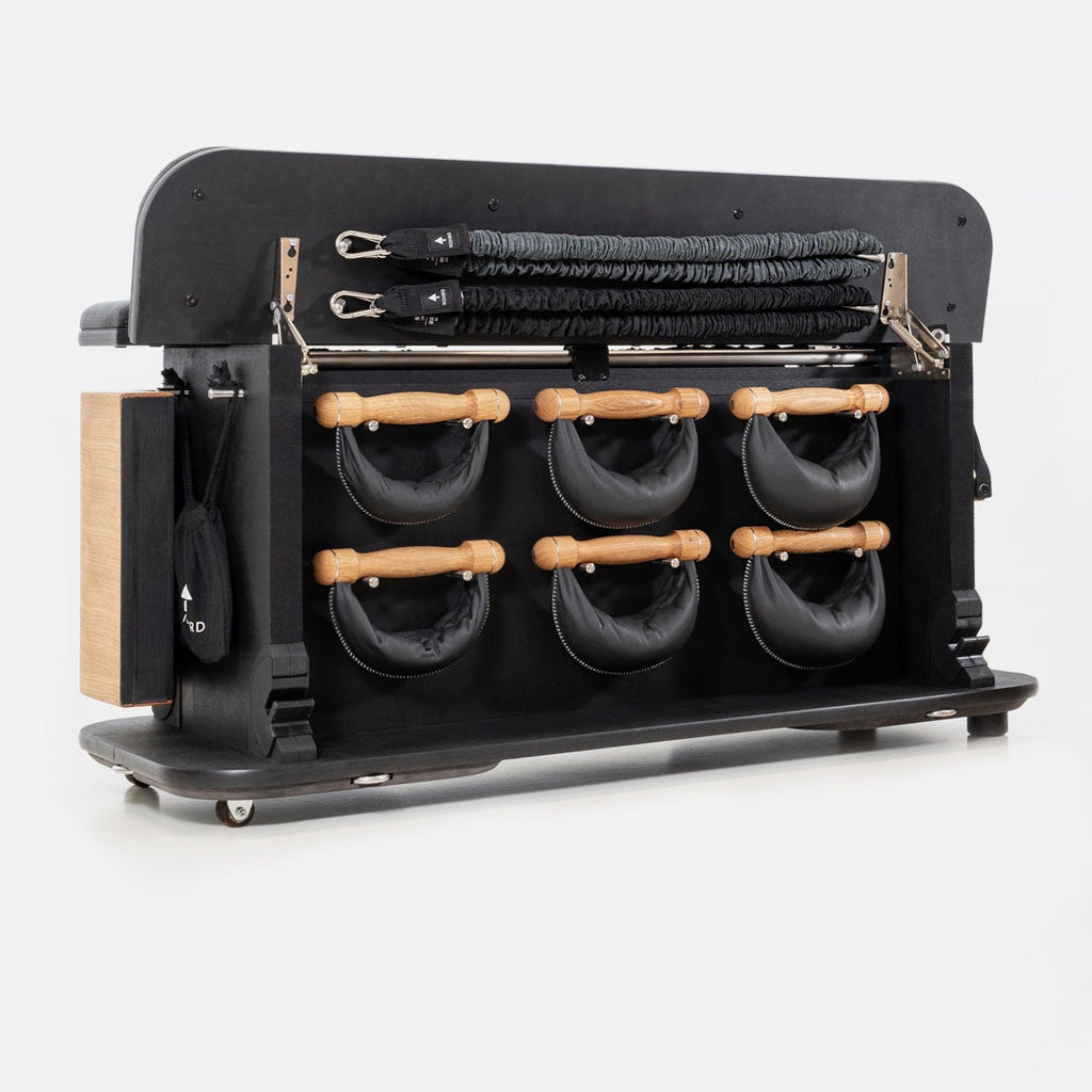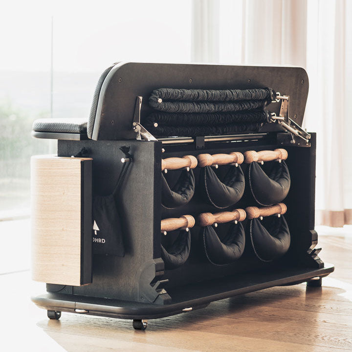 Inside, you’ll find a pair of NOHRD SwingBells in weights of: 2 kg, 4 kg and 6 kg, all neatly stored on hooks along the inner side of the box. Resistance tube bands in varying tensions are conveniently stored beneath the upholstered lids, ready to be fastened to the box or used with the handles for a variety of resistance exercises. The jump rope and tube handles are securely stored at the short end of the StepBox, making them easy to access when needed. Additionally, a cork exercise or yoga mat, measuring 180 cm x 60 cm x 0.4 cm, is stored in the second side compartment, providing a natural and comfortable surface for your workouts.